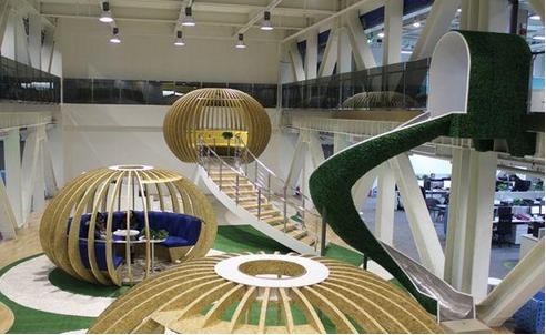 看了谷歌的休息區之后再看看國內互聯網巨頭的休息區設計——“鳥籠”。這是360總部的員工休息區設計,鳥籠設計似乎更加迎合了程序員“宅”的特點,而這個滑梯通道的設計明顯抄襲硅谷的員工通道設計。但是360休息區的整體設計在國內互聯網中以及算是“走在時尚前沿”了。