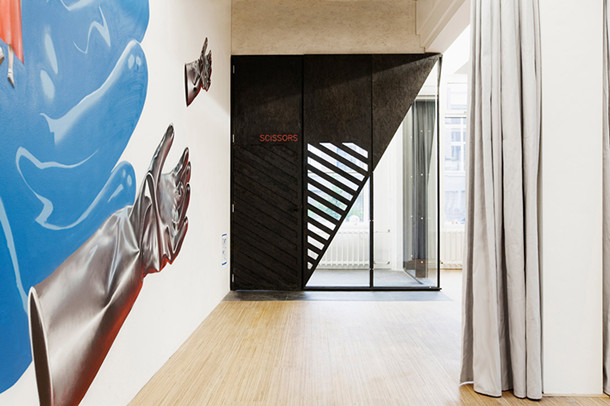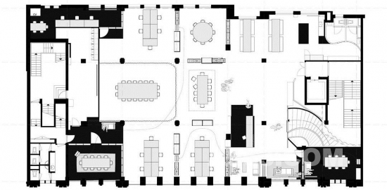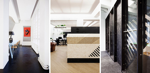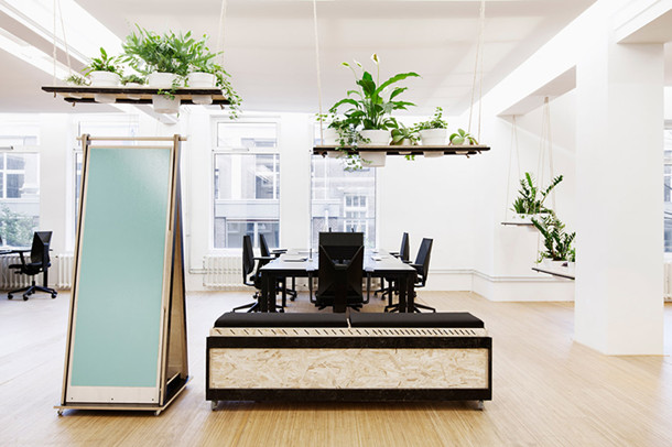 所以在設(shè)計(jì)方面,為了打造一個(gè)高表現(xiàn)力的空間、尋找低價(jià)的建筑方法,設(shè)計(jì)公司運(yùn)用了定向刨花板和數(shù)控機(jī)床設(shè)備,通過(guò)21世紀(jì)的新技術(shù)對(duì)100塊刨花板進(jìn)行切割,然后用傳統(tǒng)松木銷(xiāo)子的方法將會(huì)議室的定制框架和大部分家具固定組裝在一起。每個(gè)框架內(nèi)都安有雙層玻璃,玻璃也由木銷(xiāo)釘加以固定。整個(gè)項(xiàng)目只用到了很少的螺釘,方便日后搬家時(shí)進(jìn)行拆卸。50盆懸掛的盆栽植物以及可移動(dòng)白板和儲(chǔ)存柜將劃分出空間。中央的長(zhǎng)桌是整個(gè)工作室的核心,舞臺(tái)幕布具有多重功能,既可以區(qū)分空間,也可以圍成封閉的會(huì)議區(qū)。