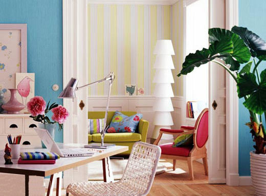 這個由糖果色打造的辦公空間會不會更加有趣呢?身后的綠植、辦公桌上的鮮花、奶白色的。