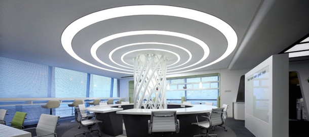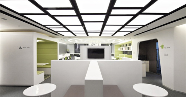 中心休閑辦公區(qū)采用光與型的結(jié)合營(yíng)造出沖擊波般的視覺張力,象征著創(chuàng)業(yè)思想的無(wú)線延伸發(fā)展。