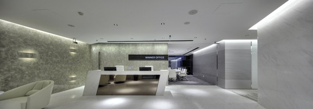 前廳的墻面設(shè)計(jì)采用云多拉灰進(jìn)口石材嵌入燈光的處理方式,雅士白石材分割出前廳的空間感,墻面嵌入的LED電視與LOGO墻滿足了客戶及時(shí)性展示不同的企業(yè)形象的需求。