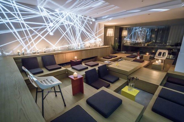 聚會——聚會是設計師們在一起經常舉辦的,每到周末,空間變化成為另一番景象,當做辦公空間中使用的前臺接待臺變為酷炫的DJ臺,擺滿各種酒水的長吧臺,7米長的投影演繹各種迷幻圖像。