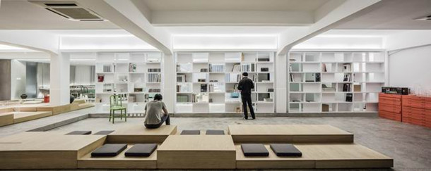 演講——兩種模數的白色木架由書架變為演講所需的坐凳,而高15公分和30公分兩種規格橡木盒堆疊成為高45公分之講臺,滿足50-100人左右的小型演講報告會,也是所謂的設計師們切磋的平臺,也是設計師自我陶醉,滿足虛榮心的試驗場。