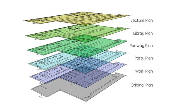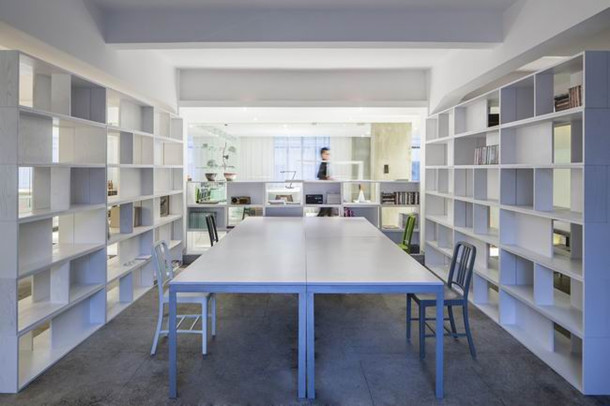 圖書館——所有的書架疊起,空間中變身成為一個小型圖書館,當然這種功能在現在只有306平米的空間中還很奢侈,但是設計師可以創造空間,設計師置身于自己絞盡腦汁創造出稱之為圖書館的空間中,或許是過一把沒有機會做一個圖書館的設計之癮,而也或許是設計師在滿足自己虛榮心的又一個意淫行為而已。