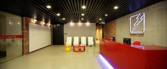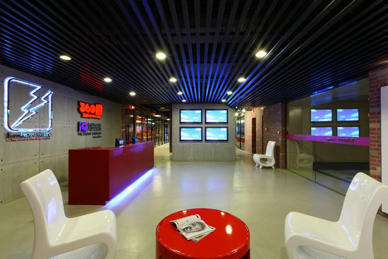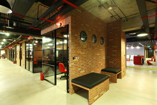 黏土磚墻,裸露的墻板為這個現代的辦公室帶來一絲工業區氛圍。大紅色的人造石前臺,彩色的桌椅配合圓潤的身形更添趣味感。黑色天花板與紅色的強烈視覺對比讓人們瞬時精神百倍。