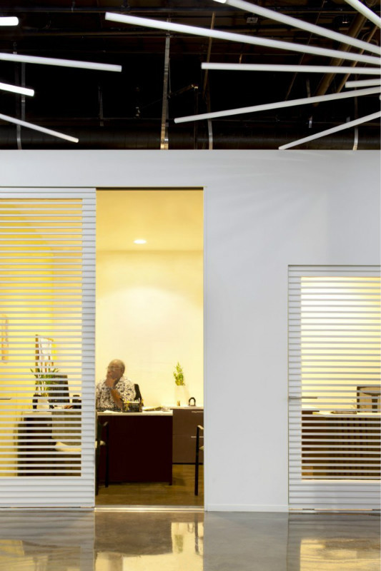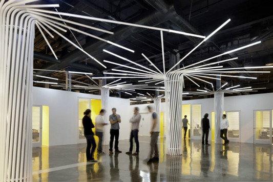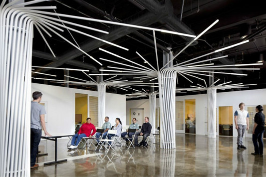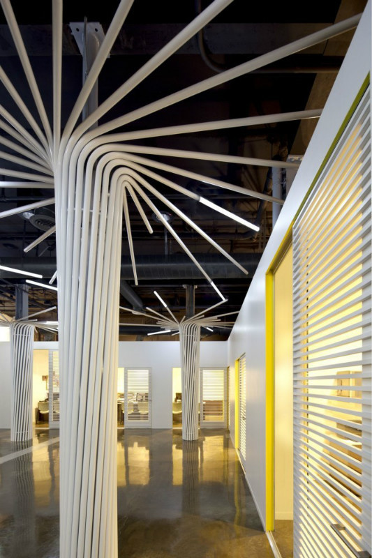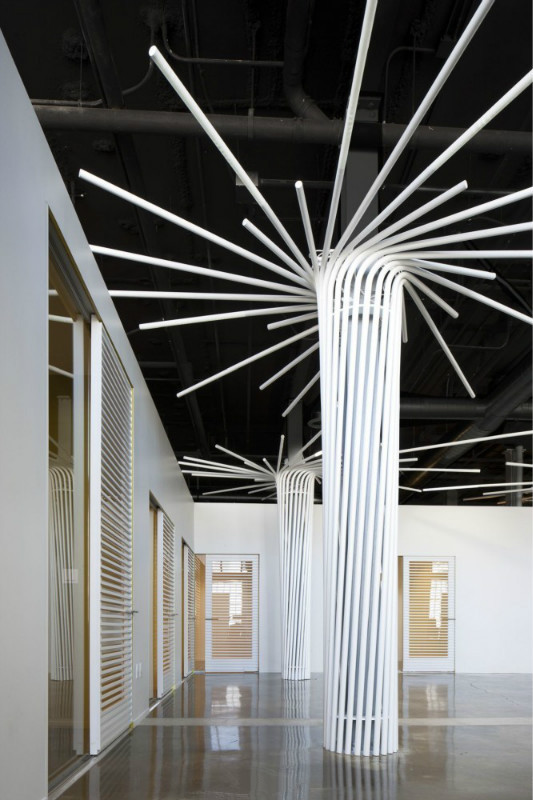 碧江上海辦公家具小編介紹介紹說,這是美國洛杉磯的貧民住房信托辦公室,里面用多根彎曲白色管狀來裝飾承重梁柱,使原本緊張壓抑的辦公室得到了放松,明亮了空間、緩解了辦公室的氣氛,人在輕松地環境里工作才能效益加倍,這樣的設計極有創意。