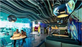 上圖是愛爾蘭谷歌休息區內景,現代感的水流式設計為主基調、藍色海洋的主要色調,擺脫了板式辦公家具的枯燥乏味,配合以簡易卻頗有設計感的圓桌、吧臺、沙發。整體舒緩的設計理念呼之欲出,如此休息環境,員工迸發出更加優質的創意靈感輕而易舉,這就是谷歌!