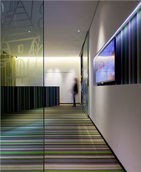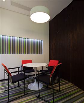 這里的前臺接待大廳,一上來就仿佛給我們帶來神來一筆一樣,大膽的采用了色彩鮮艷的BOLON地膠板來作為前臺接待廳的主基調。與此同時,在前臺接待廳墻壁上的留白剛好與彩色地板形成了一個強烈的對比,碰撞出空間獨特味道的同時,帶給人一種愜意的簡約創(chuàng)意辦公空間。