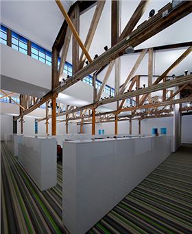 走過前臺接待大廳,迎面而來的即是職員辦公區(qū)大廳。這里采用的亦是BOLON地膠板,只不過這里用的是純白色和綠灰相間的,這種相間方式目的就是為了和百年的木構架能有一個完美的相互襯托的效果。讓照明燈與空調暖氣設備隱藏于白色柜體和木構架之后,不破壞強烈的色彩沖擊,創(chuàng)造出一個傳統(tǒng)的超現(xiàn)代辦公空間。