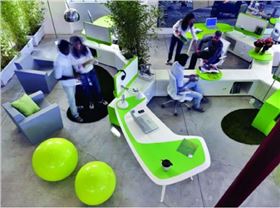 上圖是YAHOO在西雅圖的辦公室一角,整體采用較為明快的鵝黃綠作為主色調(diào),配合繁盛的綠植,休息沙發(fā)采用的藍(lán)色方正型,辦公面板的弧線和休息沙發(fā)的方正形成的視覺(jué)效果使得整體極富設(shè)計(jì)感。